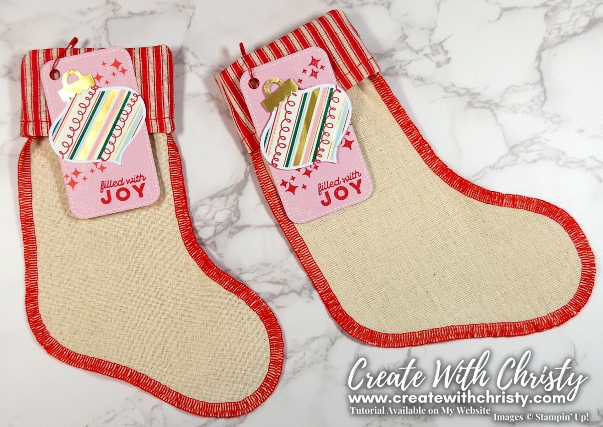 Here is the first alternative I have for you with the stockings. I dressed them up a little bit by stamping on them with some of the stamps in the kit's exclusive stamp set. I used Poppy Parade ink, which is the Stampin' Spot ink pad that came in the kit. You can see how I did it in the video above. The tag is made just like they did in the kit, so there aren't any dimensions to share.